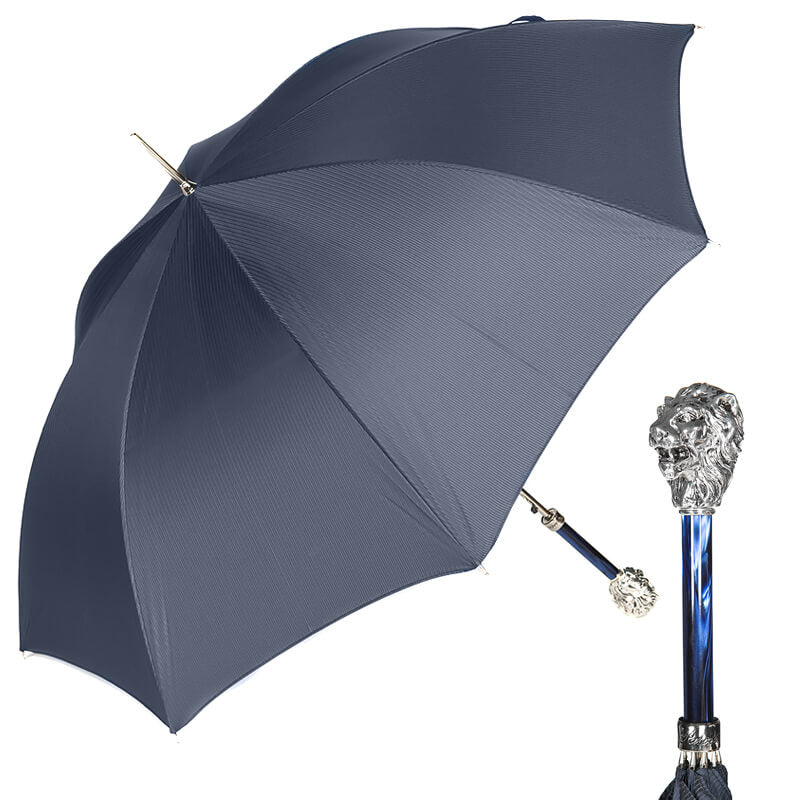 この傘のハンドルはライオンの頭の形にデザインされており、アンサンブルに個性と優雅さを加えます。シルバーの金属製で丈夫で耐久性があり、素材生地のブルーカラーとの相性も抜群です。