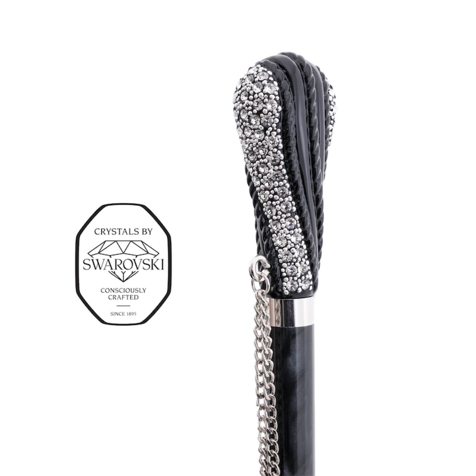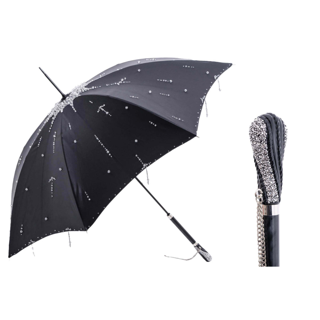 豪華な黒の女性用傘。見事なハンドルと、ドーム部分に手縫いのスワロフスキー®クリスタルが施されています。