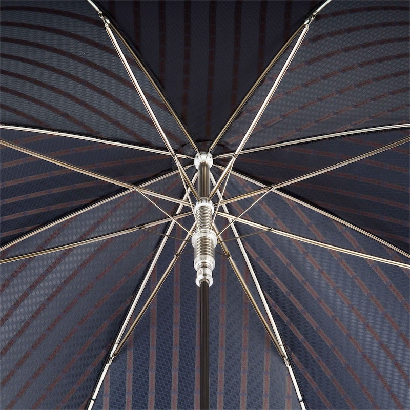 光沢のある質感の高級生地で作られた青い傘は、控えめなブラウンのプリントと内側のストライプのプリントが特徴です。シルバーの金具が全体のデザインに洗練さを加えています。