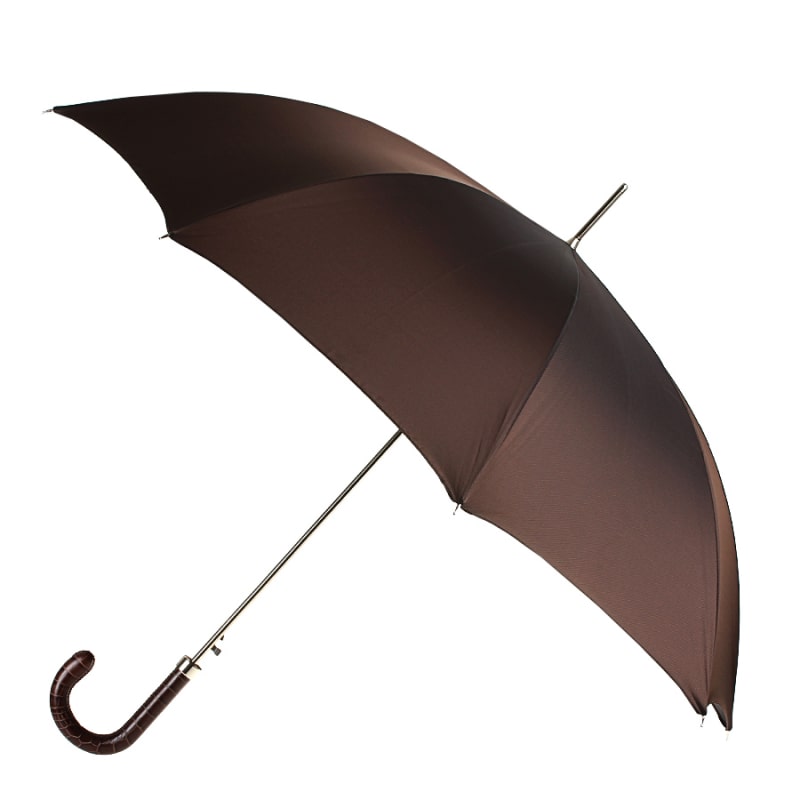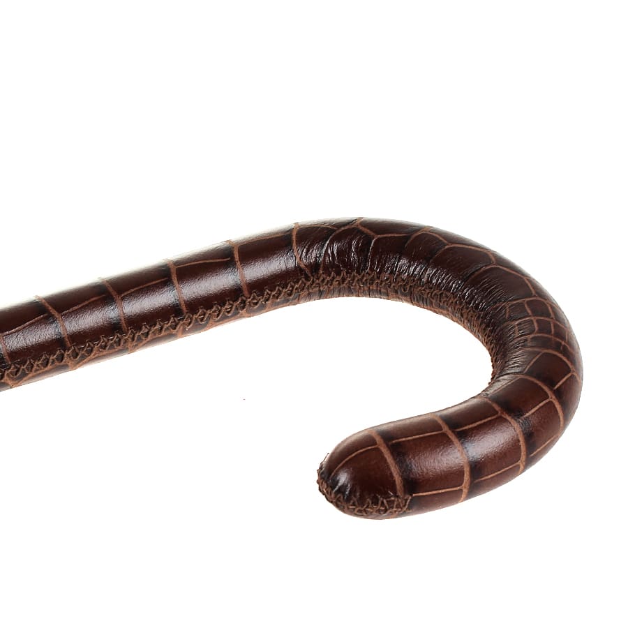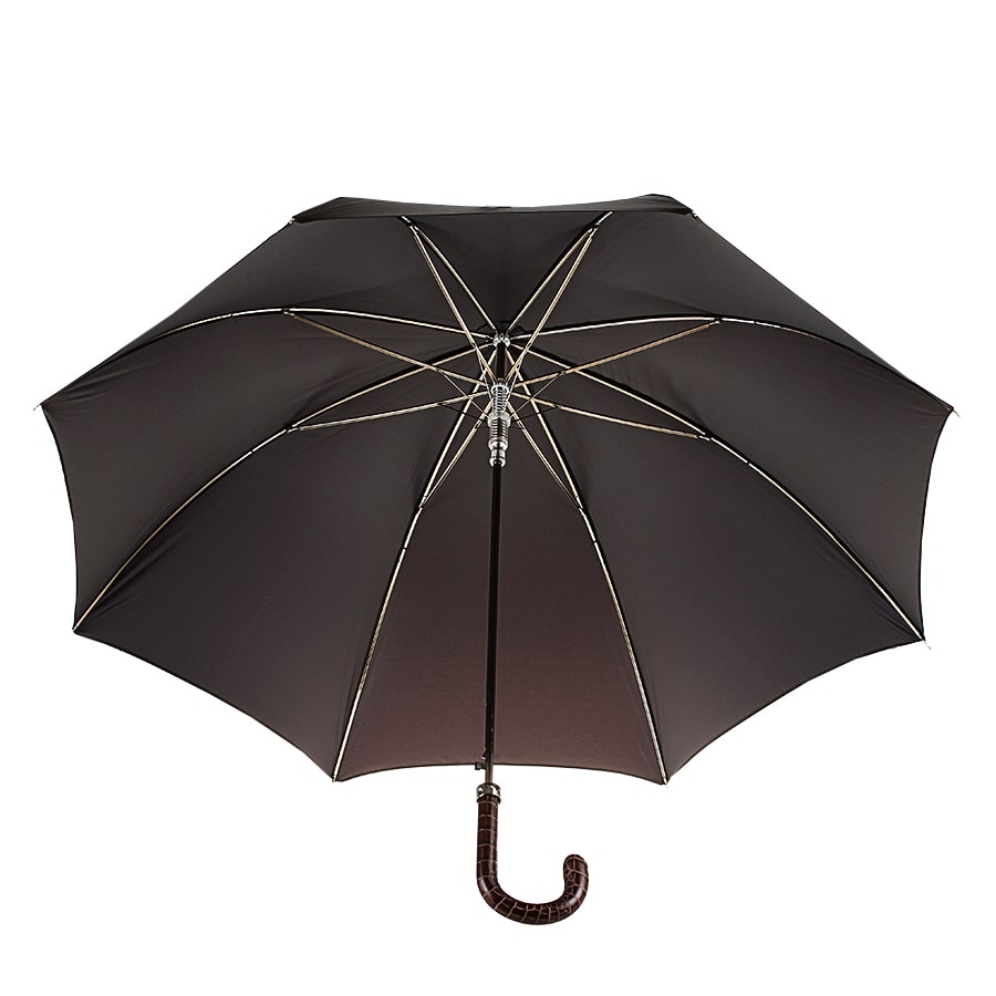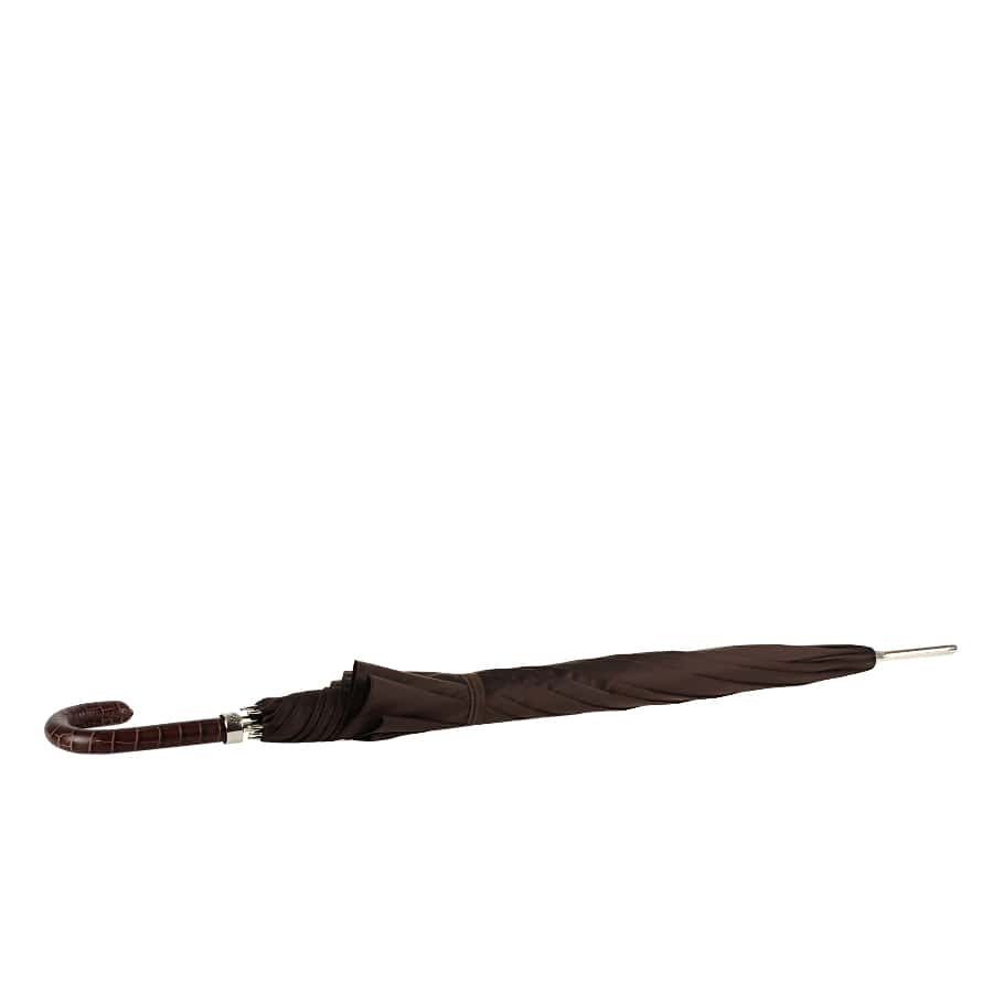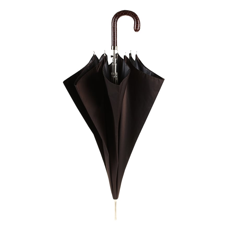 最高品質の素材で作られ、ブラウンレザーと型押しワニ模様で仕上げられたユニークなハンドルを備えたこの傘は、豪華さと洗練さを醸し出しています。