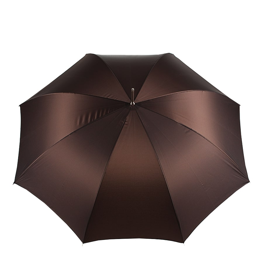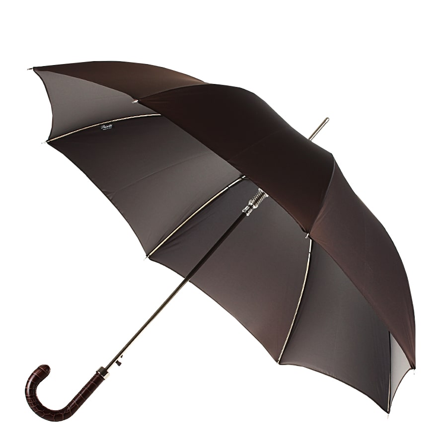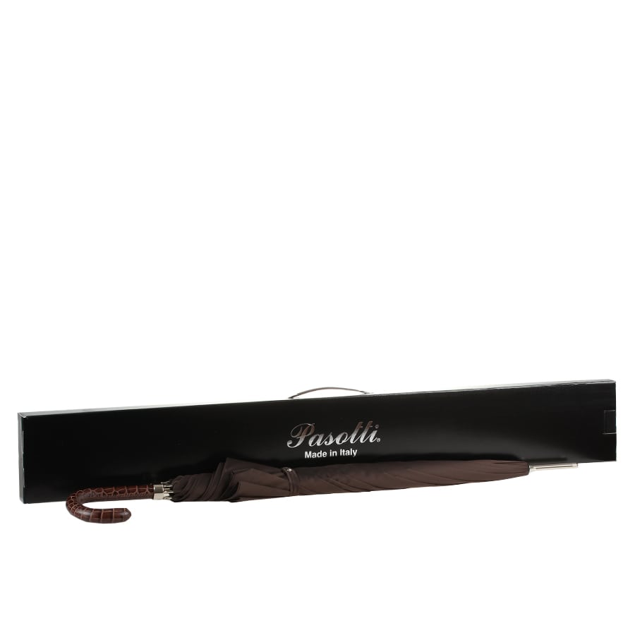 Pasottiのエンボスレザーハンドルを備えたブラウンの絶妙なメンズ傘!この傘はイタリアで手作りされ、オリジナルのデザインと卓越した品質を兼ね備えた芸術品です。
