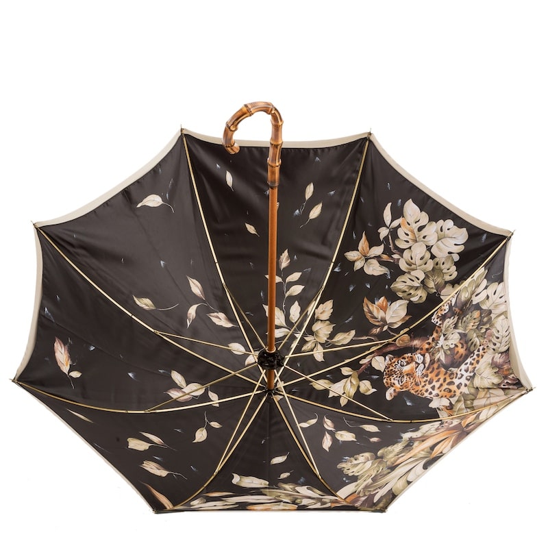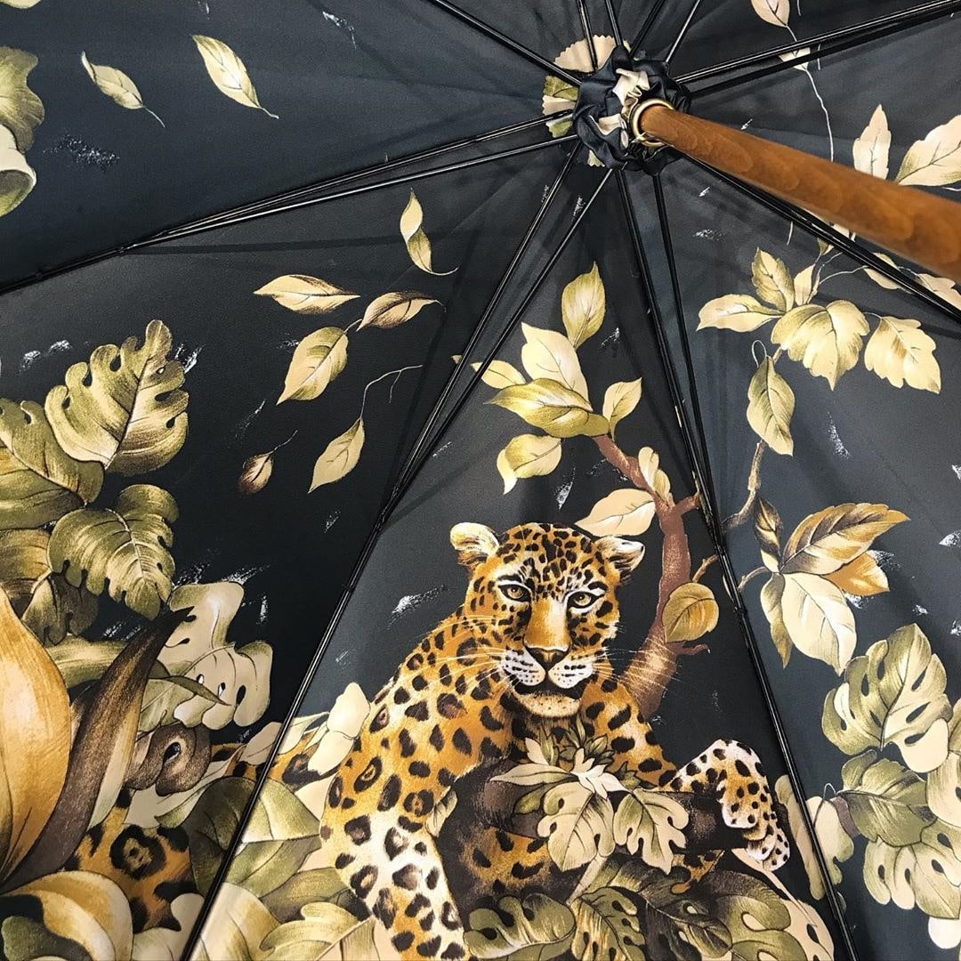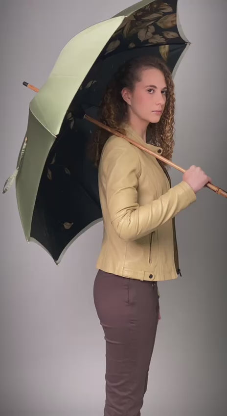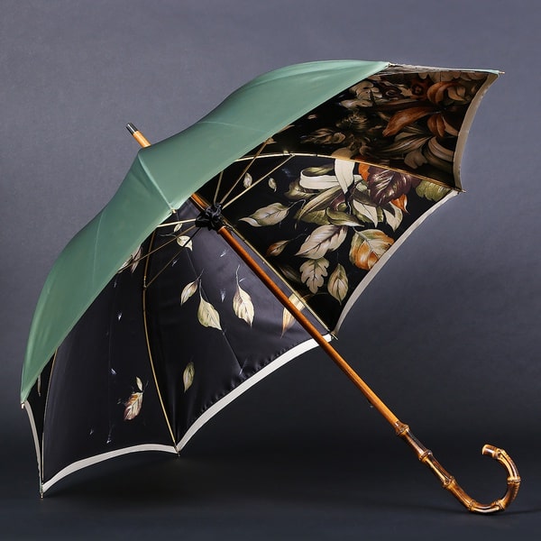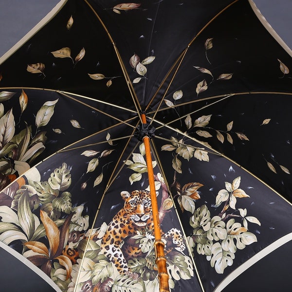 傘のドームは鮮やかなグリーンカラーで、内側には花柄のユニークなヒョウ柄がデザインにエッジの効いたスタイルを加えています。