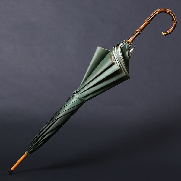 ハンドルは竹製で、快適なグリップと環境に優しい感触を提供します。傘の金具はブラックで全体のデザインにコントラストを加えており、丈夫で風にも強いです。