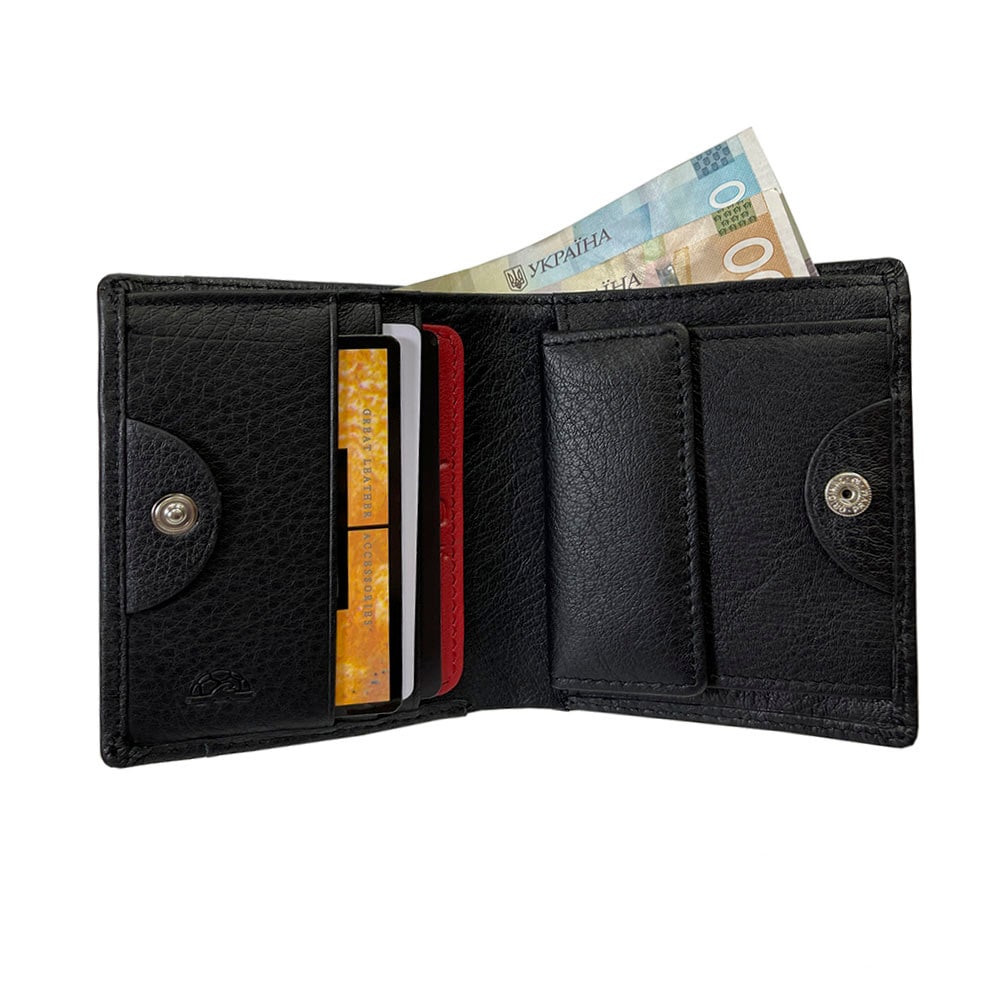 このブラックレザーウォレットは洗練された洗練された外観を持ち、シルバーの金具がエレガントなデザインを引き立てています。内側には、広々とした紙幣コンパートメントが 2 つ、カードポケットが 3 つ、ボタン開閉のコインコンパートメントが 1 つあります。メインコンパートメントは内側のボタンで開閉できるので、貴重品を常に安全に保ちます。