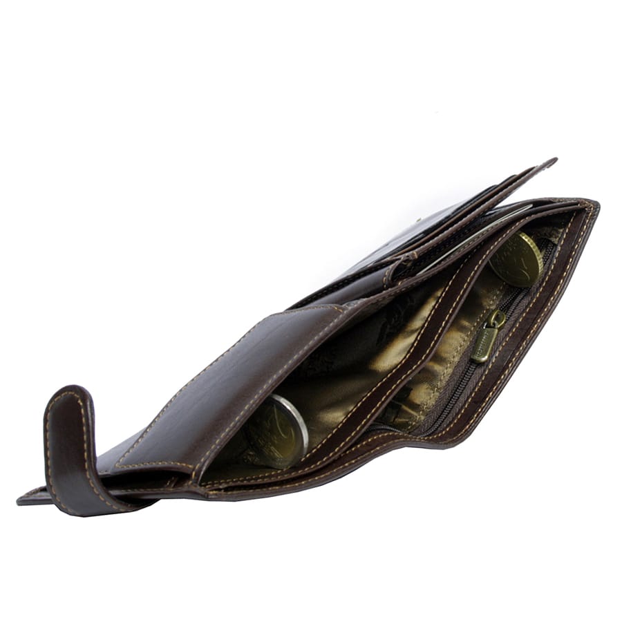 細部まで丁寧に作られたブロンズカラーの金具が、財布のリッチなブラウンレザーを完璧に引き立てます。留め具のない二つ折りのデザインで荷物の取り出しがしやすく、幅11.5cm、高さ9cmのコンパクトなサイズ感で普段使いに最適です。