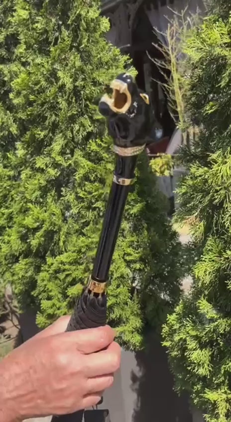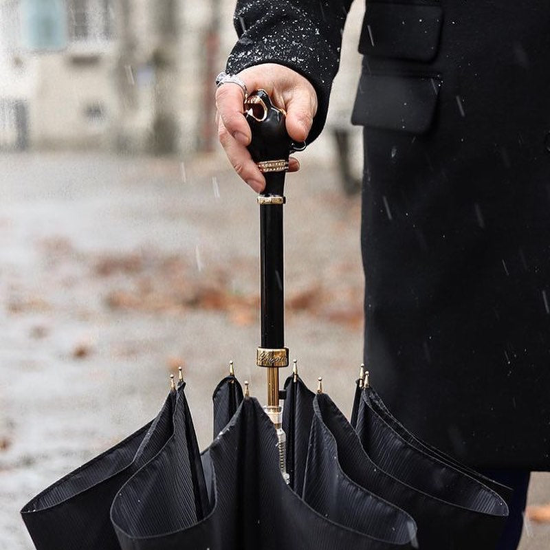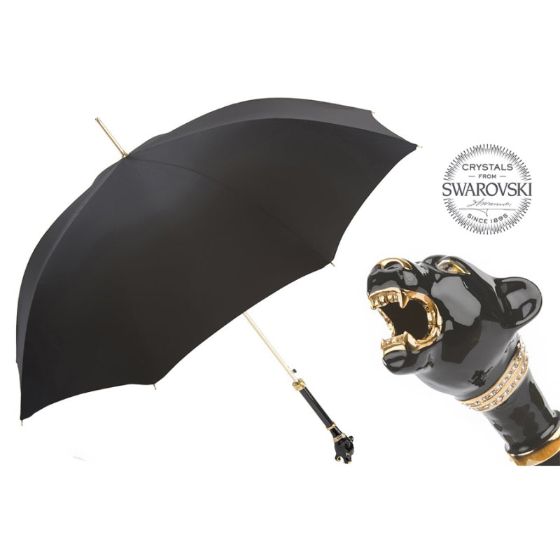 De luxe zwarte Pasotti herenparaplustok met handvat in de vorm van een panterkop geeft een stoere toets aan het beeld van een rijke man. Het hoogtepunt van deze ongelooflijke paraplu is het koperen handvat, bedekt met zwart email en versierd met Swarovski-kristallen.