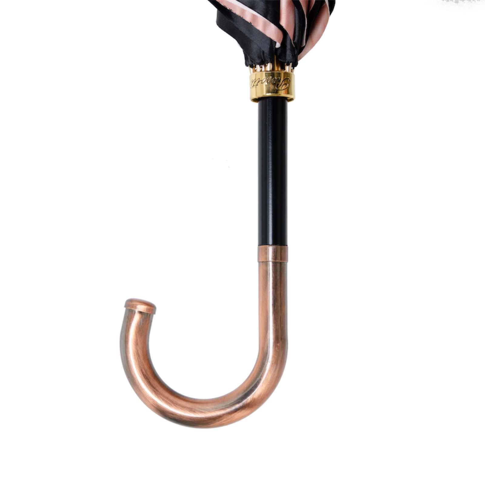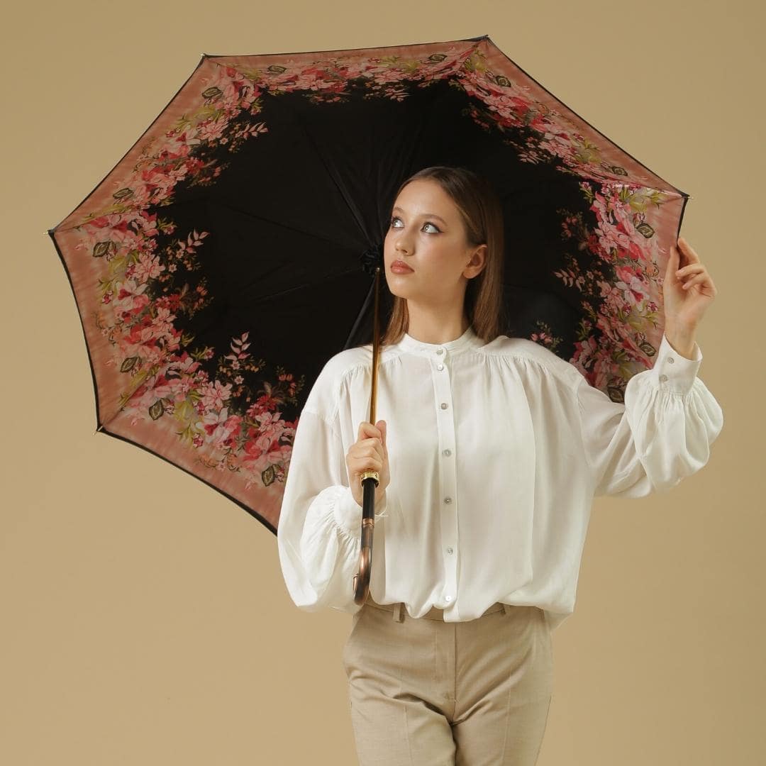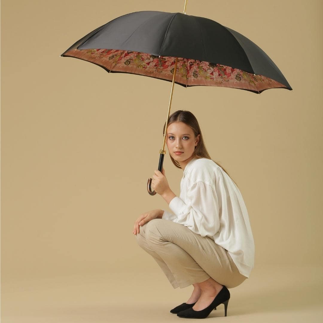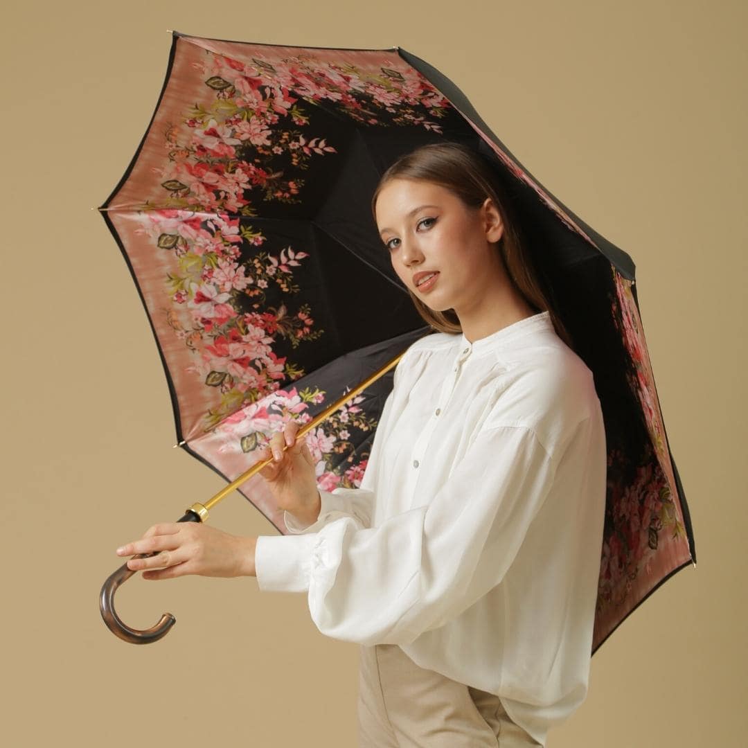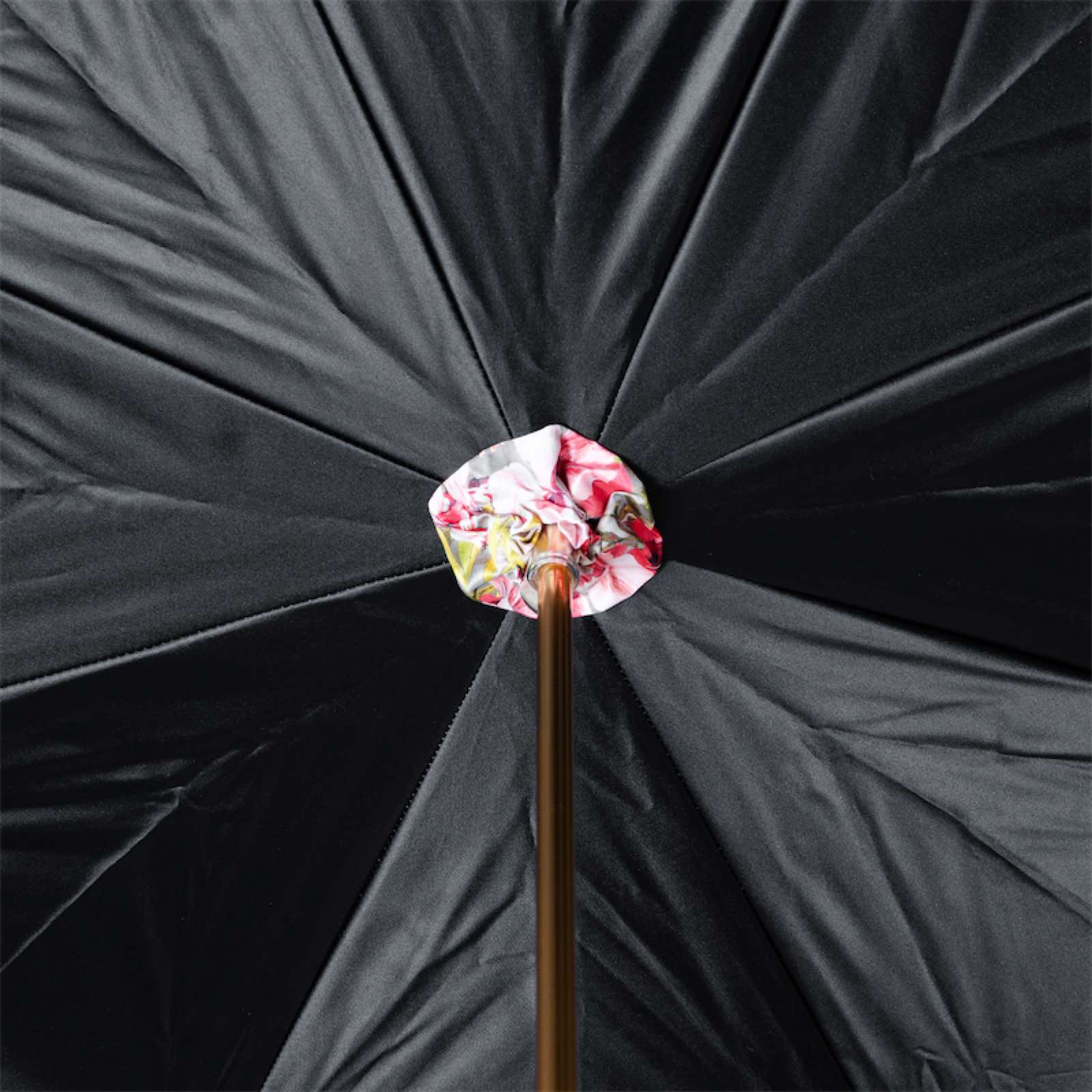 De paraplu heeft een stoffen koepel van zwart materiaal met een prachtige bloemenprint eronder, wat een vleugje elegantie toevoegt aan het algehele ontwerp. De gouden fittingen, waaronder het gebogen handvat en de speciale ring om de spaken vast te zetten, zijn de perfecte aanvulling op het zwarte en bloemendessin, waardoor deze paraplu een statement wordt.