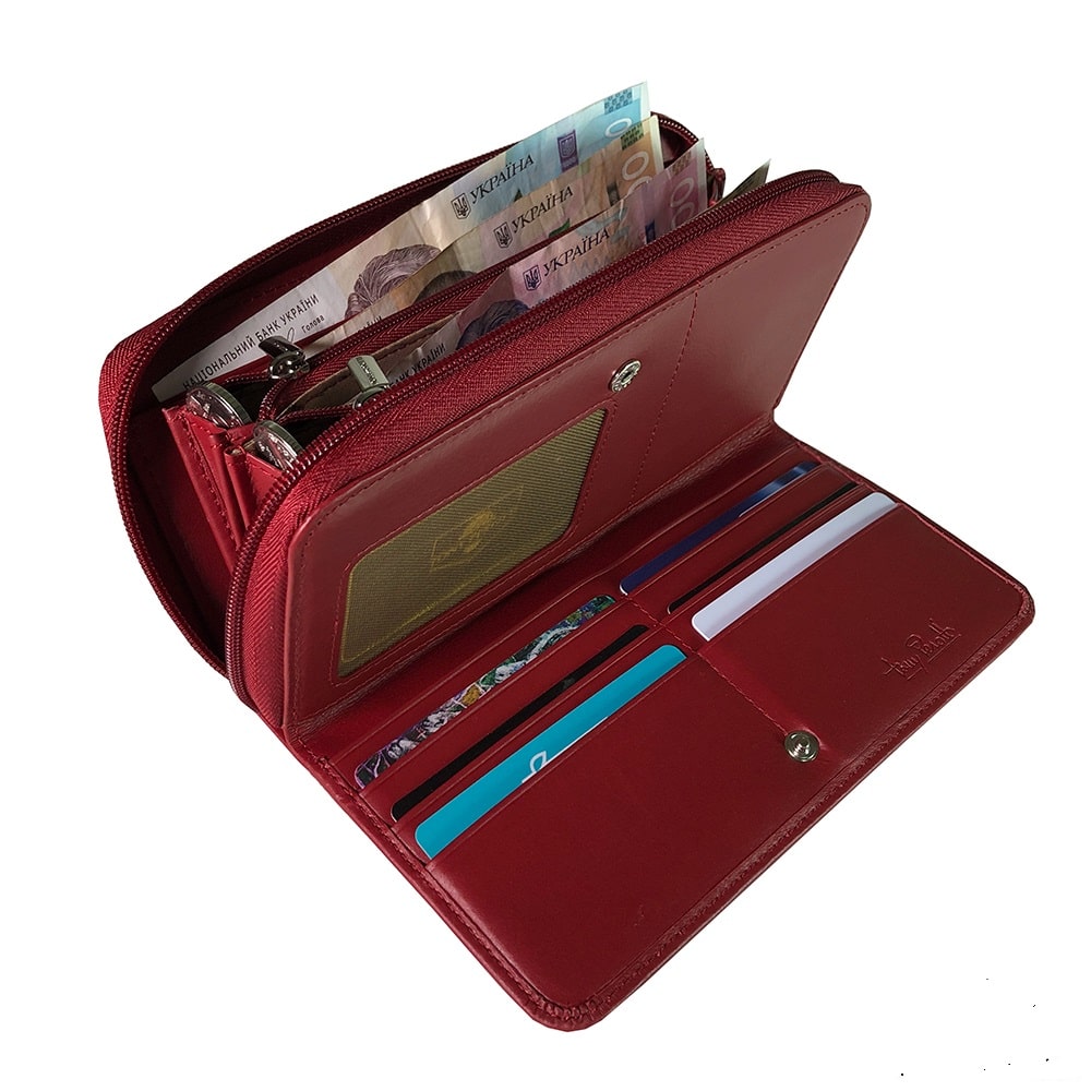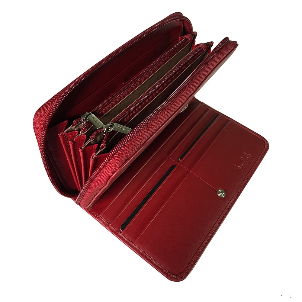 Binnenin heeft de portemonnee veel vakken en vakken voor contant geld, munten en pasjes, waaronder een vak met ritssluiting.