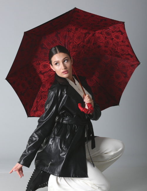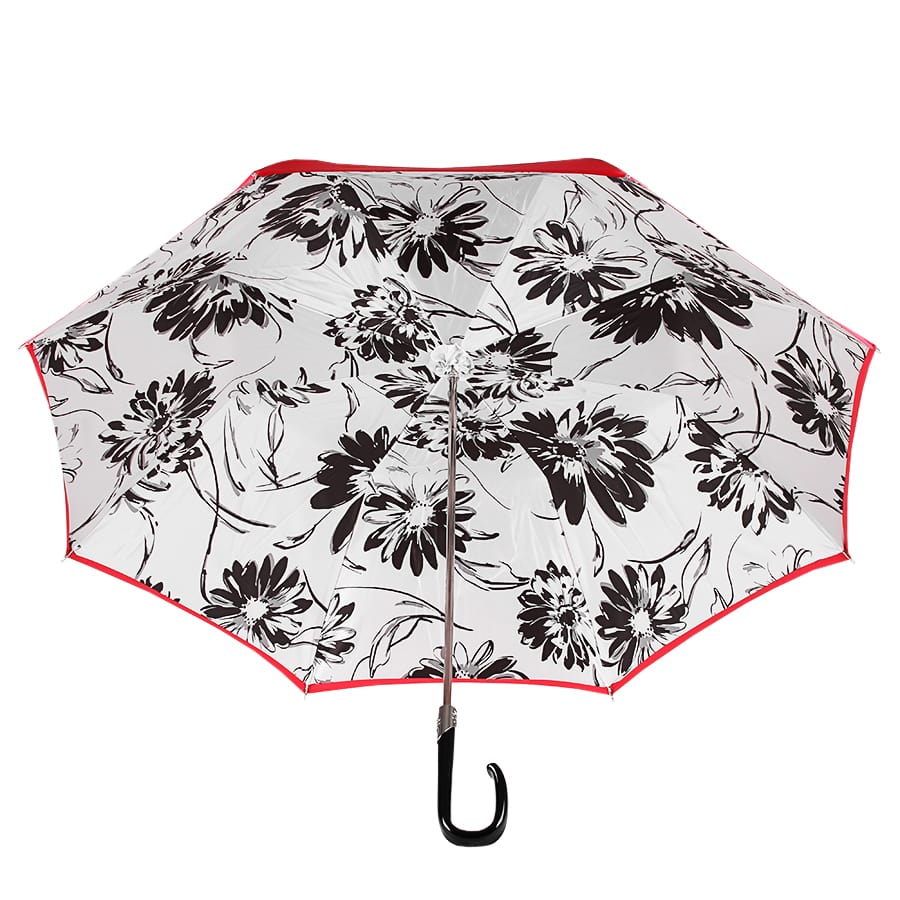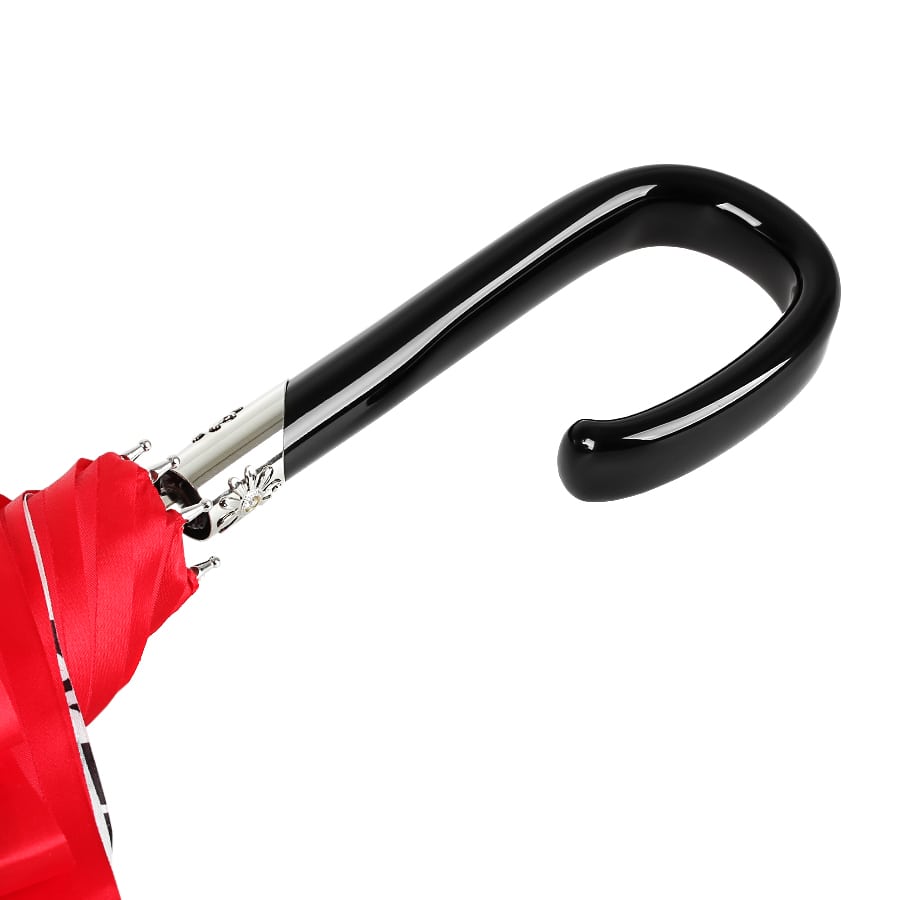 Featuring a vibrant and eye-catching bright red exterior dome, this two-layered umbrella boasts a stunning floral print in a striking black and white color scheme on the inside, adding a touch of elegance and sophistication to your look.