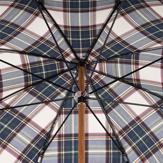 Парасолька в клітинку з суцільнодерев'яним стрижнем і коричневою шкіряною ручкою