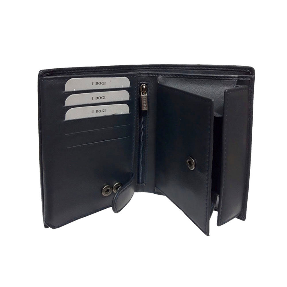 Усередині достатньо місця для зберігання: 2 відділення для банкнот, відділення для монет із застібкою на кнопку, 13 відділень для кредитних карток і дисконтних карток, а також два прозорих відділення для важливих документів. Також є вертикальна кишеня на блискавці для додаткової безпеки. Срібляста фурнітура красиво контрастує з насиченим синім кольором шкіри.